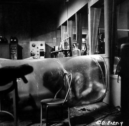 My personal favorite is the containment system for the collection of dangerously radioactive corpses that the baddies keep lying around. Every time our villains must enter the inner sanctum of their lair, we are treated to shots of them donning radiation suits, then crawling on their hands and knees through a plastic tunnel into the inner lab. And I do mean every single time, relatively lean or not, it wouldn’t be a 50’s monster flick without some padding. Personally I’d have opted for a lead lined door that you could actually, you know, open to let the zombies out, but that’s just me, always sacrificing style for efficiency. Oh, didn’t I mention that crawling through the tunnel is also the only way for the walking dead to emerge from the lab? Um, yeah, good thing these are highly coordinated dead men.