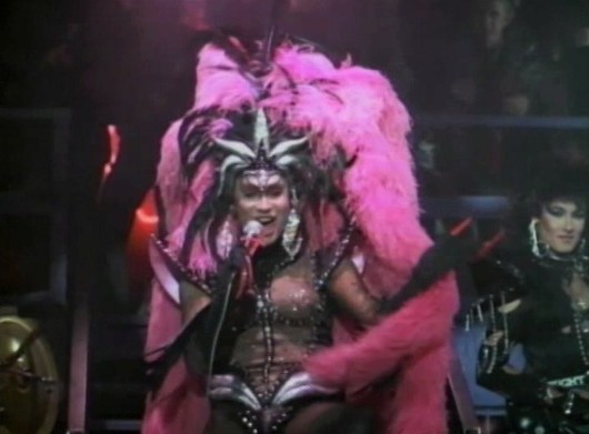 Highlights include a visit to Von Ragnar’s nightclub (because all charismatic, preapocalyptic, hermaphrodite gang leaders are also famous nightclub owners, right?). Velvet’s entrance must be seen to be believed, as Simmons makes the world’s ugliest Cher drag act ever to perform (despite having once dated the lady herself). Hilariously, Simmons must have written the lyrics for his sprechstimme opening as he would reuse some of the lyrics for the song Spit on the Revenge album several years later (“Got no manners and I’m not too clean, but I know what I like if you know what I mean”).