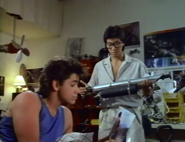 And only after this folderol do we finally get some opening credits. These will serve to help solidify the movie’s credentials as a firm contender for most 80s thing ever. Lance Stargrove (John Stamos, natch) jumps on a trampoline over his own obnoxious theme song gymnastics montage. It’s an obnoxious earworm titled Stargrove (“Stargrove! He’s running through the danger zone!”). Everyone else in the facility (sweaty metrosexual men) does gymnastics, while John just bounces, because he has no gymnastic ability whatsoever. Well,crap, George Lazenby pops up in the opening credits, which doesn’t bode well for his post-Bond career. After the bouncing is over, but before the damned song ends, we also get our first glimpse of Lance’s Nerdy Asian Roommate™ Cliff (Peter Kwong) in awful 80s clothes, who is sending Lance test answers on a big Seiko calculator watch. Because that’s komedy gold right there.